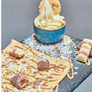 £7.50Freshly cooked Crepe, served with a delicious combination of crunchy Oreo® crumbles. Drizzled in white chocolate sauce. Served with Soft serve ice cream or whipped cream